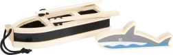 Wypłyń na przygodę z tą solidną drewnianą piracką łodzią SMALL FOOT, pełną detali i akcesoriów. Czekają na Ciebie podnoszone żagle, funkcjonalne działo z filcowymi kulami, ruchome figurki piratów, łódka, papuga, skrzynia ze skarbem, beczka oraz rekin. Realistyczne elementy, takie jak kotwica na wciągarce, drabinki linowe, żuraw z hakiem i schowek w ładowni, wspierają zabawę w odgrywanie ról i rozwój motoryki dziecka.