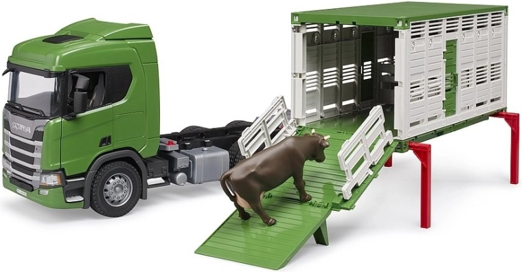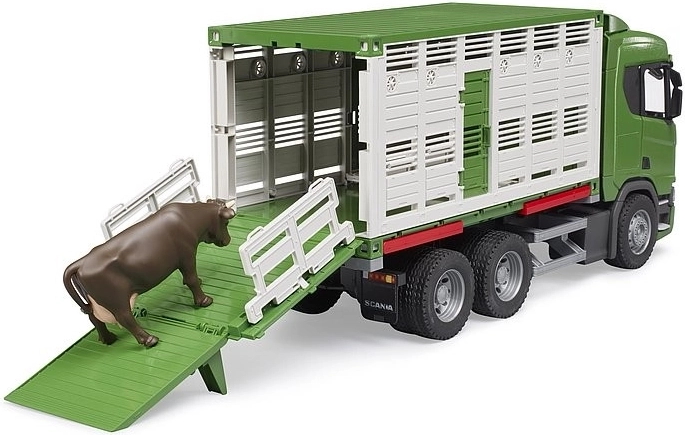Realistyczny transporter zwierząt BRUDER na podwoziu SCANIA ucieszy małych farmerów świetnymi funkcjami i solidnym wykonaniem. Oferuje składane i wysuwane rampy, otwierane drzwi, składane lusterka oraz wewnętrzne bramki dzielące. W zestawie znajduje się figurka krowy, miękkie bieżniki opon dla cichej jazdy oraz możliwość uzupełnienia o moduł świetlno-dźwiękowy dla jeszcze większych wrażeń z zabawy.