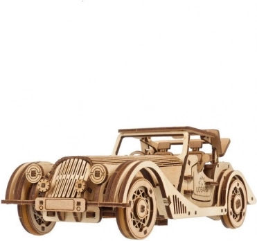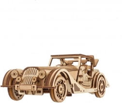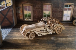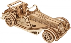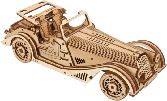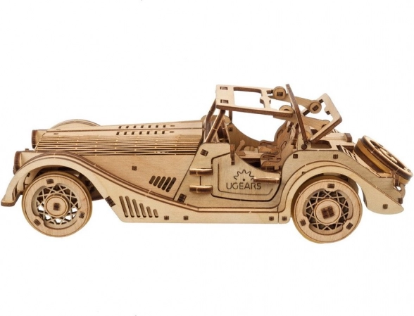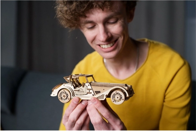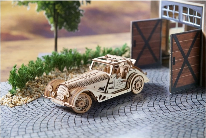 Model wyróżnia się detalicznym wnętrzem, otwieranymi bocznymi drzwiami, ręcznie sterowanym stałym dachem z oknem dachowym oraz działającym kołem zapasowym w bagażniku. W zestawie znajdziesz wszystko, czego potrzeba – elementy są wstępnie wycięte, a montaż wykonasz według ilustrowanej instrukcji w 11 językach. Pozostaw naturalne drewno lub pomaluj pojazd według własnej fantazji.