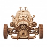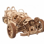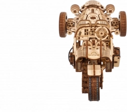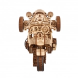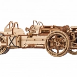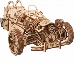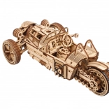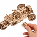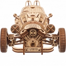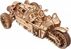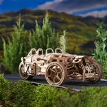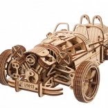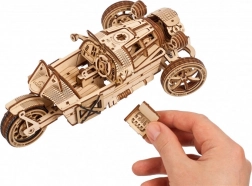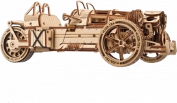 Trójkołowiec UGEARS UGR‑S łączy klasyczny urok motoryzacji ze sprytną mechaniką. Sprężynowy silnik i napęd łańcuchowy wprawiają w ruch tylne koło, model jest w pełni sterowalny i potrafi przejechać około 4 metry po linii prostej. Przełącznikiem skrzyni biegów łatwo wybierzesz tryby Park/Drive, a podczas jazdy zobaczysz w akcji pięknie wykonane tłoki i koła zębate.