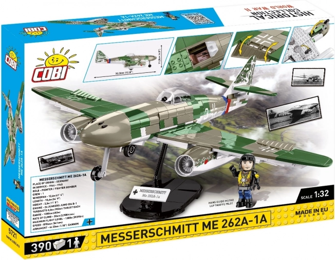 COBI prezentuje przekonująco odwzorowany model legendarnego niemieckiego odrzutowego myśliwca MESSERSCHMITT Me 262 A-1a, pierwszego bojowego samolotu odrzutowego użytego w walce. Kamuflaż i oznaczenia bazują na eksponacie muzealnym z Deutsches Museum w Monachium. Figurka pilota inspirowana jest Hansem Guidem Mutkem.
