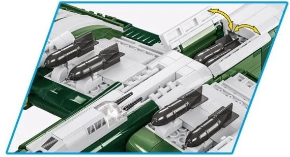 Zestaw zawiera 1160 elementów z odpornymi nadrukami (bez naklejek), nowo zaprojektowane części dla realistycznej kabiny, otwierane komory bombowe, zdejmowane bomby oraz funkcjonalne podwozie. W kokpicie jest miejsce na figurkę pilota (w zestawie). Intuicyjna instrukcja z piktogramami zapewnia płynne budowanie.