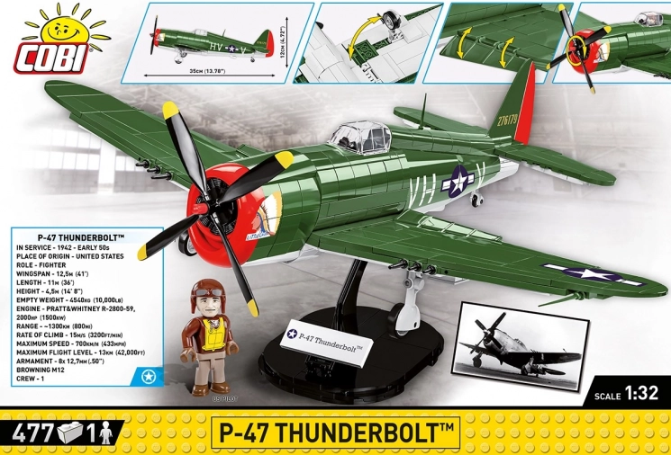Zbuduj legendarny amerykański myśliwiec P-47 THUNDERBOLT w skali 1:32 z 477 wysokiej jakości elementów COBI. Model oferuje trwałe nadruki bez naklejek, ruchome elementy (koła, śmigło, lotki), figurka pilota oraz stojak ekspozycyjny z tabliczką. Idealny dla miłośników historii, lotnictwa i kolekcjonerów.