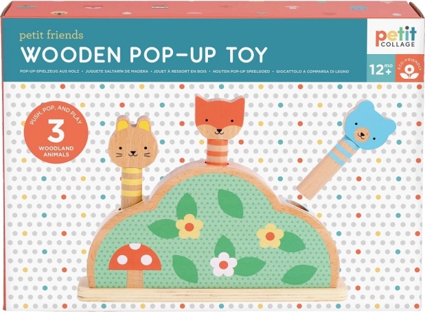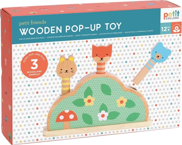 Odkryj radosną i bezpieczną zabawę dla maluchów z drewnianą wyskakującą zabawką PETIT COLLAGE. Trzy leśne zwierzątka na sprężynkach czekają, aż dzieci je wcisną i puszczą, aby wyskoczyły – świetna aktywność rozwijająca małą motorykę, koordynację ręka–oko oraz zrozumienie przyczyny i skutku. Wykonana z drewna certyfikowanego FSC®, drukowana nietoksycznymi, wodnymi tuszami i zapakowana w ekologiczne opakowanie.