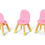 Krzesełka mają różowe siedziska i lekkie drewniane nogi z neonowo żółtymi końcówkami, perfekcyjne dla dzieci.