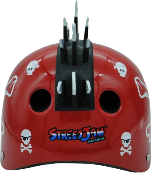 Stylowy czerwony kask Piraci dla rowerzystów, skateboardzistów i rolkarzy. Oferuje dziewięć chłodzących otworów wentylacyjnych i wytrzymałą na uderzenia wzmocnioną polimerową powłokę dla bezpieczeństwa.
