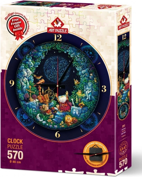 - okrągłe puzzle 570 elementów; okrągła płyta podkładowa; mechanizm zegarowy z akcesoriami; 4 części ramy; 8 klipsów łączących ramę