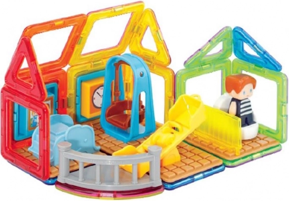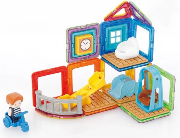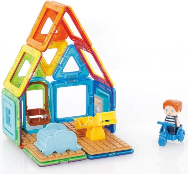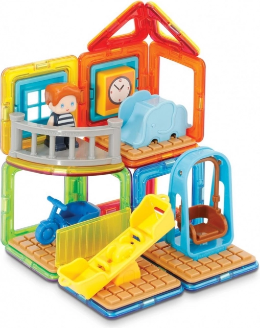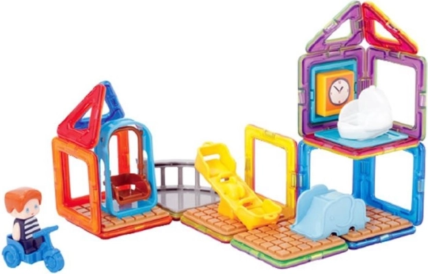 Baw się z Maxem i jego boiskiem. Kreatywna magnetyczna układanka pozwala tworzyć wiele trójwymiarowych obiektów z dwuwymiarowych plastikowych wielokątów. Magformers ćwiczy małą motorykę, pobudza kreatywność, uczy dzieci kolorów i podstawowych kształtów geometrycznych. Wymiary elementów i odpowiednio dobrane kształty zapewniają maksymalne możliwe bezpieczeństwo zabawki. Materiał, z którego wykonano zestaw, spełnia najsurowsze kryteria higieniczne i zdrowotne. Elementy są wystarczająco duże, nie można ich połknąć i są praktycznie niezniszczalne. Zawartość opakowania: