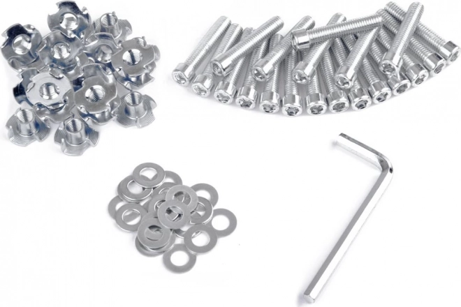 Zestaw montażowy zawiera wszystkie niezbędne elementy metalowe, w tym śruby, podkładki i klucz sześciokątny do solidnej instalacji.