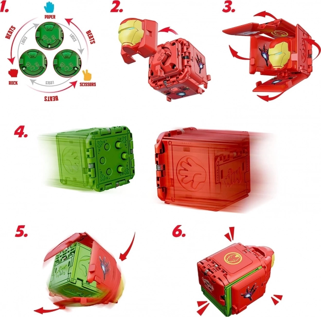 Odkryj emocjonującą grę z motywami MARVEL Avengers, łączącą proste zasady, elementy kolekcjonerskie i szybką akcję. Każda kostka skrywa wybór kamień, nożyce lub papier pod maską ulubionego bohatera. Ustaw ruch, zakryj go maską, rzućcie kostkami naprzeciw siebie i wyłoncie zwycięzcę – kamień pokonuje nożyce, nożyce pokonują papier, a papier pokonuje kamień.