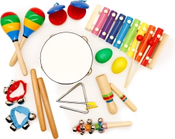 Od tamburyna i trójkąta po marakasy i dzwoneczki – różnorodny zestaw instrumentów pobudza ciekawość i wspiera pierwsze muzyczne kroki.