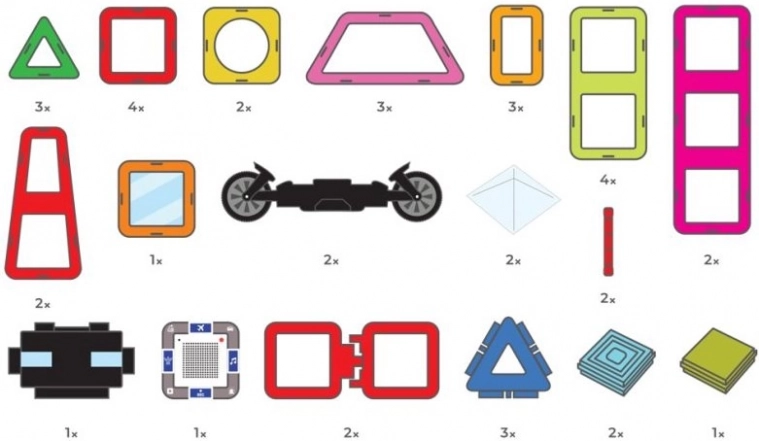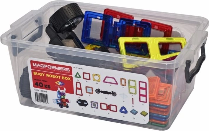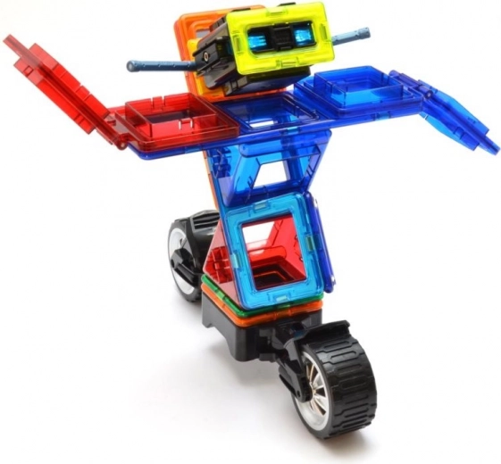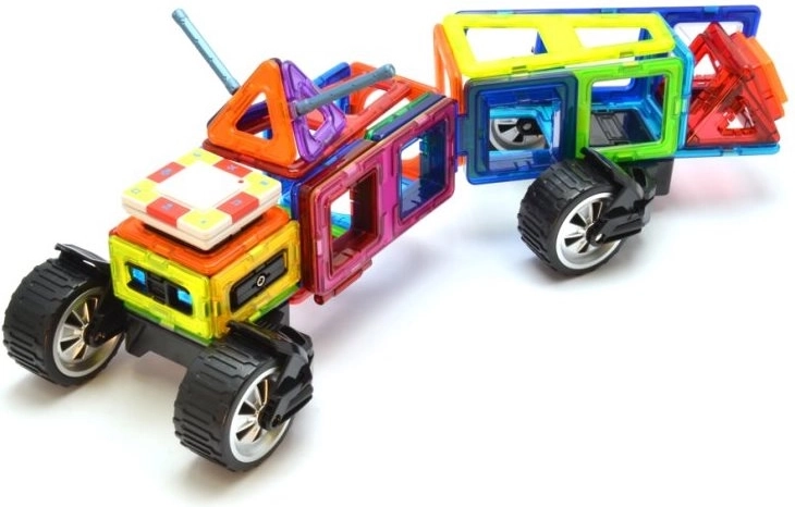 Pudełko jest idealne do budowy jeżdżących robotów ze swobodnie regulowanymi ramionami, a także motocykli, ciężarówek i przyczep. Trzy trójścienne nakładki oraz bogaty zestaw prostokątów pomagają tworzyć solidne szkielety na wysokość i długość. Dzieci poćwiczą pracę z połączeniami magnetycznymi, rozwiną wyobraźnię, percepcję przestrzenną i małą motorykę. Elementy są bezpieczne, wytrzymałe i kompatybilne z GEOMAG.
