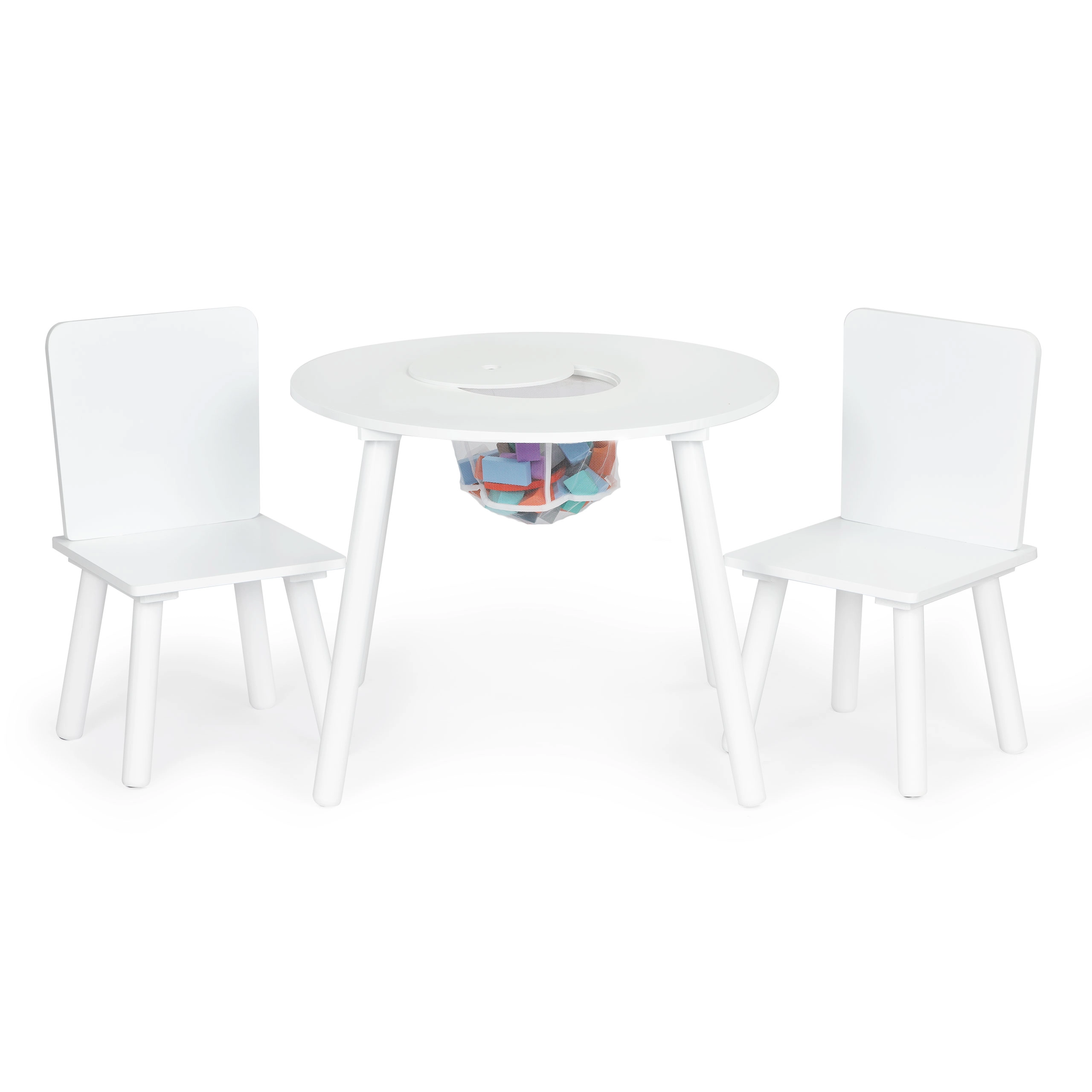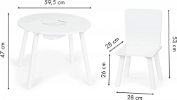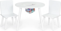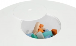Praktyczna uchylna pokrywa pośrodku blatu skrywa siatkowy kosz, do którego dzieci w mgnieniu oka schowają klocki, kredki czy drobne zabawki. Zestaw wpasuje się w nowoczesne wnętrza w stylu skandynawskim i świetnie sprawdzi się w pokojach dziecięcych, salach zabaw i poczekalniach.