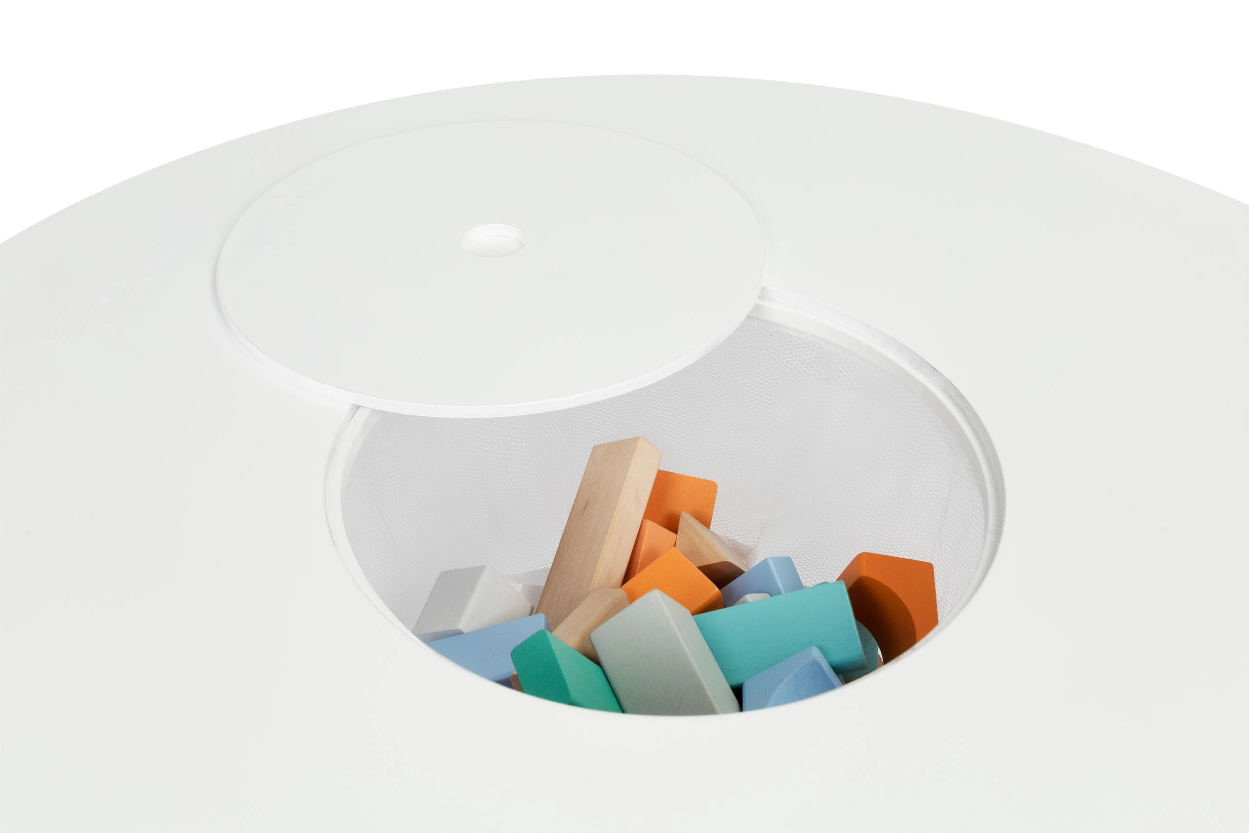 Uchylna środkowa pokrywa odsłania praktyczny siatkowy kosz – idealny na klocki, kredki i drobne zabawki. Sprzątanie zajmuje kilka sekund, a powierzchnia robocza pozostaje czysta.