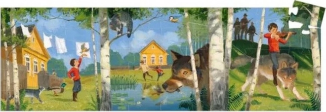 Odkryj poetycki świat baśni Piotruś i wilk z panoramicznymi puzzlami DJECO. Dzięki 50 solidnym elementom dzieci poćwiczą motorykę małą, myślenie logiczne i cierpliwość, jednocześnie ciesząc się zabawnym układaniem pięknej ilustracji. Gotowe puzzle mają wymiary około 62 × 20 cm i świetnie nadają się do wyeksponowania.