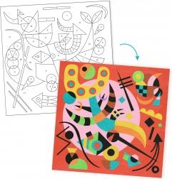 Ten kreatywny zestaw przynosi zabawę i edukację w jednym opakowaniu. Zawiera cztery ilustrowane karty, które dzieci mogą ozdobić za pomocą dwunastu różnokolorowych piasków. Zestaw jest dostarczany z plastikowym narzędziem i szczegółową broszurą, która dostarcza instrukcji krok po kroku. Dzieci uczą się o twórczości i technikach Wassily Kandinsky'ego, bez robienia bałaganu, ponieważ pracują w zamkniętym pudełku, co pomaga utrzymać piasek na miejscu.