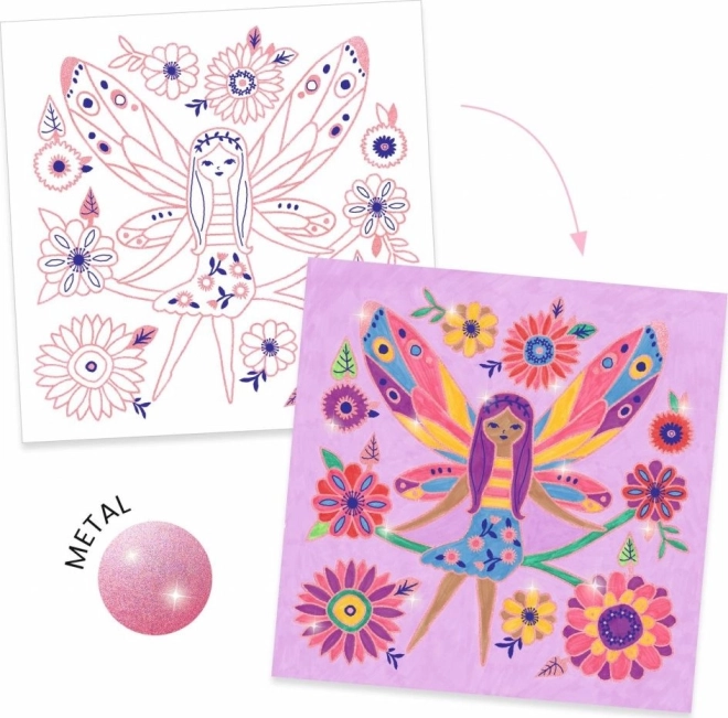 Odkryj magiczny świat kolorowanek z brokatowymi kolorowankami Wróżki od Djeco. Te kolorowanki są specjalnie zaprojektowane do łatwego kolorowania, dzięki brokatowym podniesionym krawędziom, które prowadzą cię i zapewniają, że zostaniesz w linii. Praktyczny wzór dostarcza kolorową wersję każdego obrazu, co ułatwia inspirację i kreatywność.
