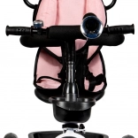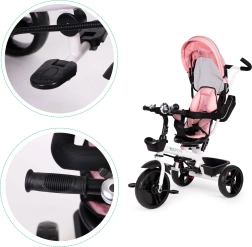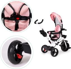Trójkołowy pojazd posiada wygodne, wyściełane siedzisko, które jest wyposażone w pięciopunktowy pas bezpieczeństwa oraz drążki ochronne, co minimalizuje ryzyko upadku. Daszek chroni przed niekorzystnymi warunkami pogodowymi i słońcem.