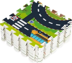 Wesoły piankowy dywan puzzle z motywem miasta, dróg i skrzyżowań tworzy miękkie i bezpieczne miejsce do zabawy. 12 elementów (30×30 cm) z certyfikowanej pianki EVA łatwo składa się jak puzzle do wymiaru 114×86 cm. Dywan jest antypoślizgowy, amortyzuje upadki dzięki grubości 1 cm, izoluje od chłodu i łatwo go utrzymać wycierając wilgotną ściereczką.