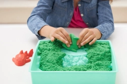 W zestawie 454 g zielonego piasku, foremki do morskich zwierzątek i zamku oraz łopatka do kopania, nabierania i przesypywania. Piasek wykonany jest z naturalnego piasku i stanowi świetną alternatywę dla plasteliny – wspiera motorykę małą, kreatywność i samodzielną zabawę.
