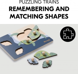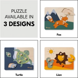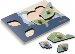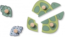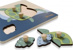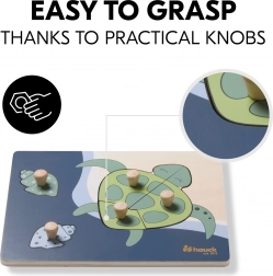 Drewniana układanka z uchwytami Turtle została zaprojektowana dla małych dziecięcych rączek. Każdy element ma drewniany guzik dla łatwego chwytania i precyzyjnego wkładania. Podczas układania dziecko trenuje małą motorykę, koordynację oka i ręki, pamięć oraz postrzeganie kształtów i kolorów. Zaokrąglone krawędzie zapewniają bezpieczną zabawę już od 12 miesięcy.