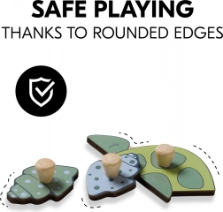 Każdy element ma drewniany guzik, który ułatwia dzieciom podnoszenie i precyzyjne umieszczanie w odpowiednim miejscu – idealne dla początkujących.