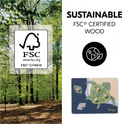 Zabawka wykonana jest z drewna z certyfikatem FSC, dzięki czemu jest przyjazna dla środowiska i wytrzymała na codzienną zabawę. Delikatna paleta zielonych i niebieskich tonów pobudza ciekawość, a jednocześnie działa kojąco.
