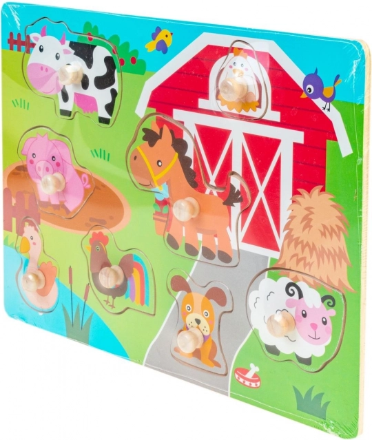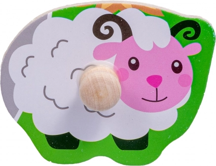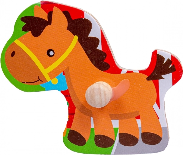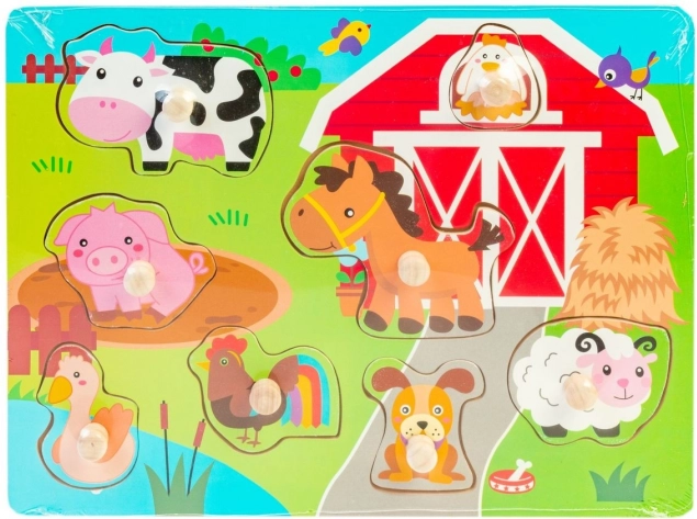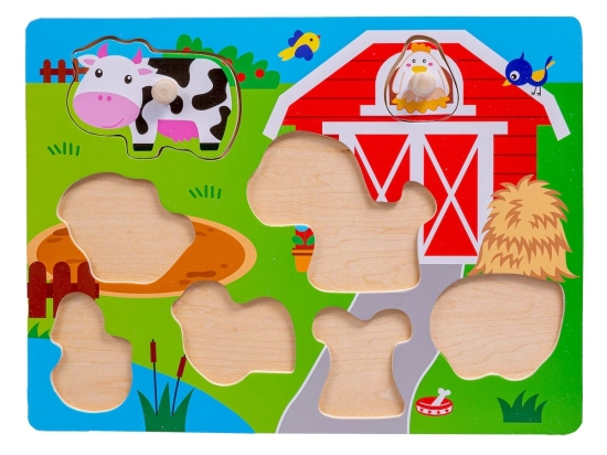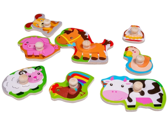 - Drewniane puzzle z obrazkami zwierząt, idealne do nauki nazw i wyglądu zwierząt żyjących na wsi.