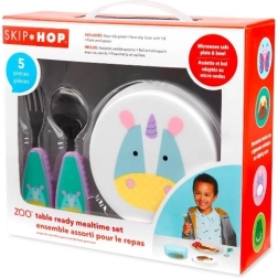 Wprowadź dzieci do samodzielności podczas posiłków z tym uroczym zestawem stołowym. Każdy zestaw zawiera ikoniczne postacie ZOO, talerz z antypoślizgowym spodem, miseczkę z pokrywką i pasujące sztućce. Zestaw jest odpowiedni dla dzieci w wieku 12 miesięcy i więcej.