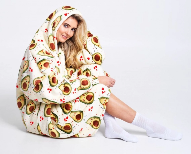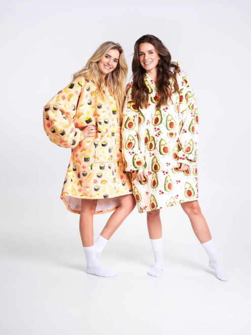 Ciesz się maksymalnym komfortem z kocem-bluzą Cozy Noxxiez Awokado – połączeniem bluzy i koca w jednym. Wnętrze to ciepły sherpa fleece, a zewnętrzna warstwa to supermiękki flanel. Dzięki pojemnemu kapturowi i dużej przedniej kieszeni ogrzejesz dłonie i głowę. Idealna do chillowania na kanapie, pracy przy komputerze, czytania oraz na zewnątrz w chłodniejszą pogodę.