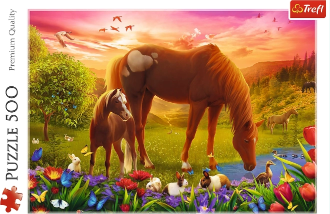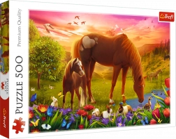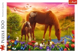 Ciesz się spokojnymi chwilami z puzzlami przedstawiającymi urokliwe konie na zielonej łące. Dzięki 500 elementom układanie stanowi przyjemne wyzwanie dla początkujących i zaawansowanych, a gotowy obraz o wymiarach 480 × 340 mm doskonale nadaje się do oprawienia w ramkę.