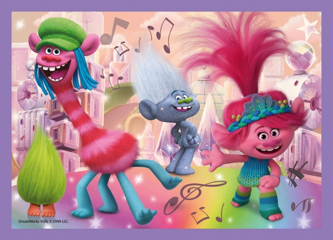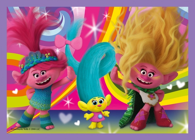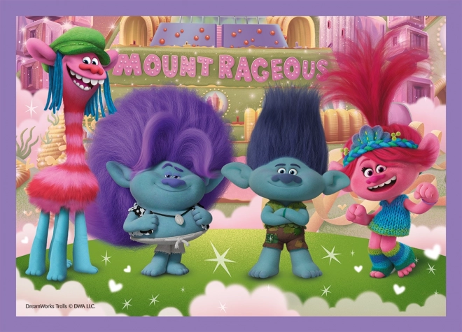 Odkryj radość układania z barwnymi bohaterami z filmu Trolle. Zestaw 4w1 łączy cztery oddzielne obrazki ze stopniowo rosnącą liczbą elementów, dzięki czemu nadaje się dla dzieci, które uczą się i sukcesywnie doskonalą swoje umiejętności. Każde puzzle po ułożeniu mierzy około 28,5 × 20,5 cm.