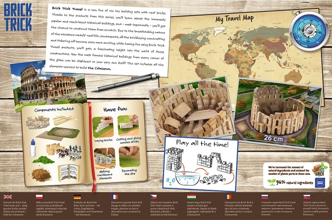 Zbuduj kultowe Koloseum z naturalnych materiałów dzięki zestawowi TREFL BRICK TRICK Travel. Zestaw zawiera ponad 450 glinianych cegiełek, drewniane listewki i dekoracje dla realistycznego efektu. Dzięki klejowi rozpuszczalnemu w wodzie możesz budować wielokrotnie, rozwijać zręczność, wyobraźnię i koncentrację oraz tworzyć według instrukcji lub własnej fantazji.