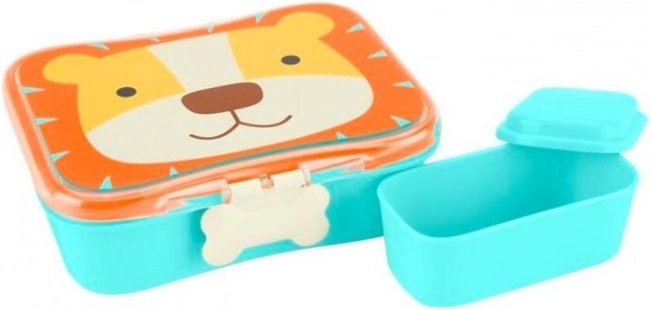 Piękne pudełko na przekąski w stylu Skip Hop, zaprojektowane w kolekcji Zoo, składa się z dwóch części: pojemnika na przekąski z zamykaną pokrywką oraz mniejszego pojemnika na ciasteczka.