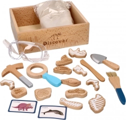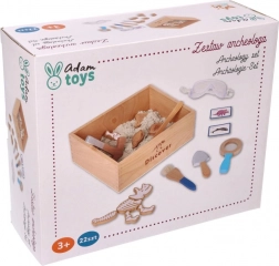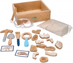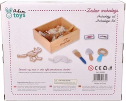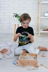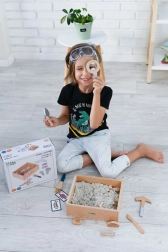 W zestawie znajduje się wszystko, czego potrzebuje mały paleontolog: od skrzyneczki odkrywcy przez narzędzia (młoteczek, lupa, nożyk, pędzelek, łopatka) po kości dinozaurów, ryby i skamieliny. Dwie dwustronne karty pomagają łatwo identyfikować wykopane znaleziska. Piasek wyprodukowano w UE i spełnia normy bezpieczeństwa.