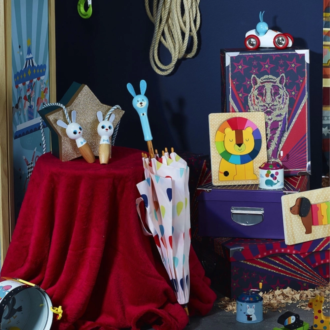 Odkryj czarujący dziecięcy parasol VILAC z rączką w kształcie królika Raoula. Precyzyjnie wykonana drewniana rączka jest przyjemna do trzymania, a zabawny motyw zwierzątka zachęca dzieci do noszenia parasola samodzielnie. Metalowa konstrukcja zapewnia stabilność i wytrzymałość nawet przy gorszej pogodzie.
