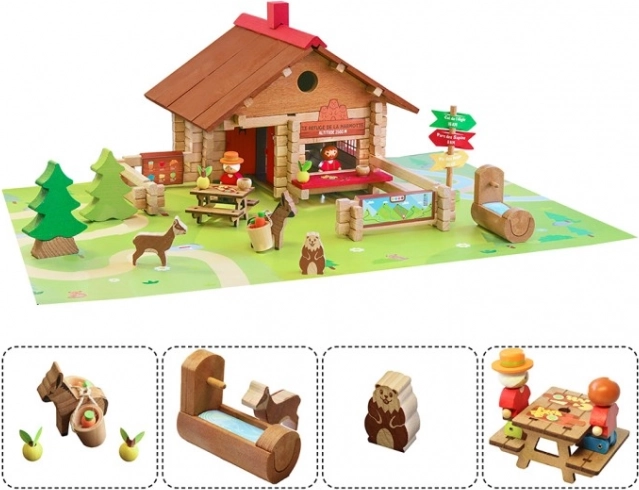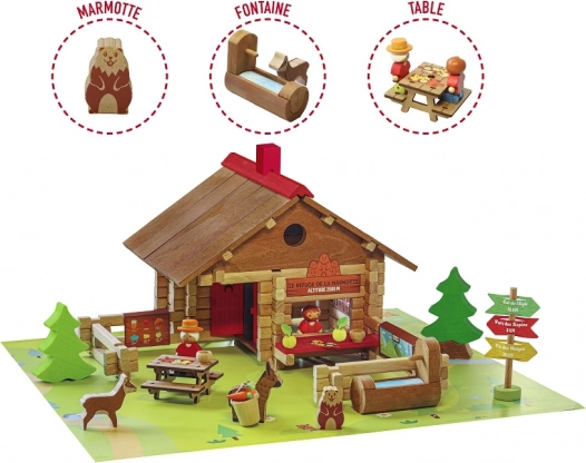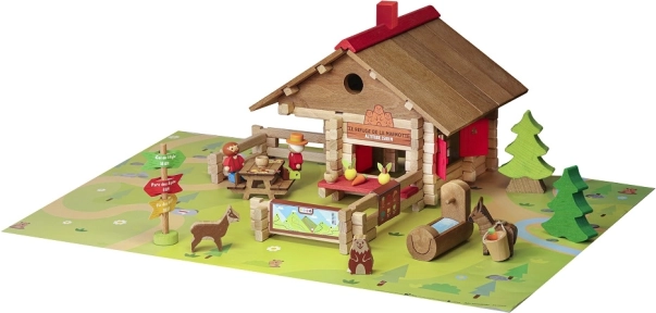 Ta autentyczna drewniana konstrukcja z serii Jeujura przybliża dzieciom świat górskich chat i zwierzęcych przyjaciół. Elementy z litego drewna bukowego i sosnowego pochodzenia francuskiego łatwo do siebie pasują i pozwalają budować stabilne domki z realistycznymi detalami. W zestawie znajdują się także tematyczne dodatki – stół piknikowy, fontanna oraz figurki (np. osioł, kozica i świstak), które pobudzają wyobraźnię i zabawę fabularną.