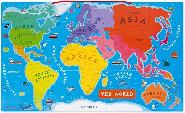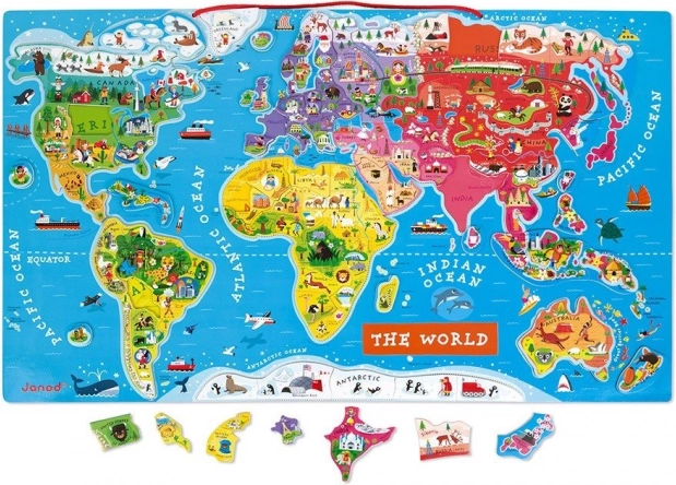 Ta piękna magnetyczna mapa świata ma wymiary 77 x 46 x 1 cm i zawiera 92 drewniane elementy puzzli. Każdy element przedstawia region lub kraj, zawiera nazwę stolicy oraz ilustrację charakteryzującą dane miejsce, takie jak ważne budowle, zabytki, zwierzęta i rośliny. Mapa jest w języku angielskim i można ją zawiesić na ścianie, dzięki czemu staje się wyjątkową ozdobą pokoju dziecięcego.
