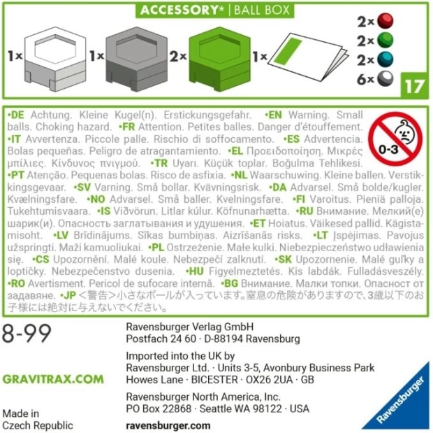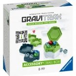 W tym zestawie GraviTrax znajdziesz 12 kolorowych kulek: 6 srebrnych, 2 czerwone, 2 niebieskie i 2 zielone. Kulki można uporządkować według koloru lub wymieszać wedle własnej wyobraźni. W skład zestawu wchodzą także 4 pudełka do przechowywania kulek – 2 zielone, 1 białe i 1 szare. Pudełka można układać jedno na drugim, co umożliwia przechowywanie nawet w mniejszych przestrzeniach.