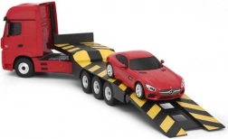 Przewieź AMG GT na naczepie niskopodwoziowej ciągnika MERCEDES-BENZ ACTROS i ciesz się autentycznym załadunkiem oraz jazdą. Świetne do kreatywnej zabawy i dla kolekcjonerów.