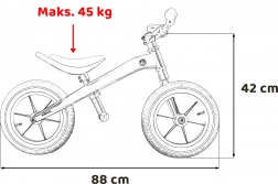 Rowerek biegowy posiada certyfikaty CE, TUV i GS, co zapewnia wysoką jakość i bezpieczeństwo. Z maksymalnym obciążeniem do 45 kg i całkowitą masą 5 kg jest stabilny i łatwy w obsłudze.