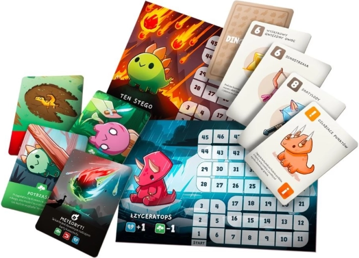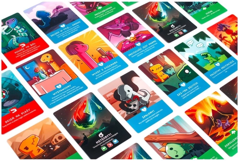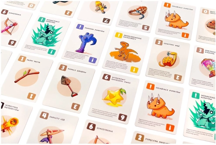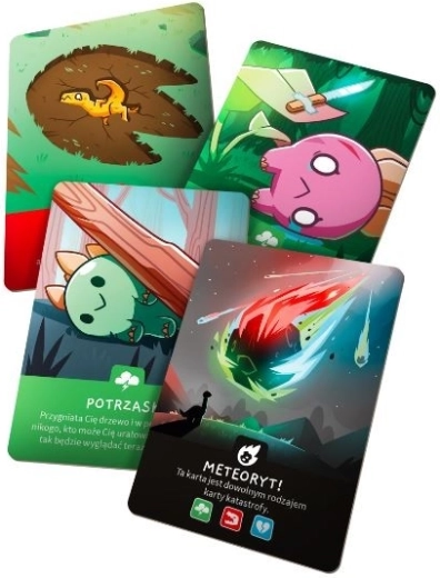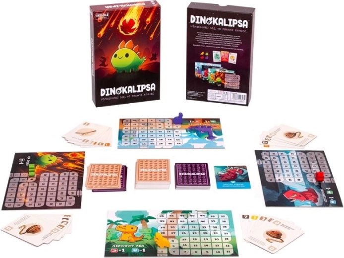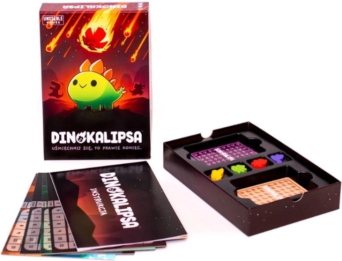 Dinokalipsa to strategiczna gra karciana od twórcy Odd Unicorns! W trakcie gry jesteś dinozaurem, a życie co jakiś czas daje ci w kość. Będziesz próbować unikać katastrof naturalnych, drapieżnych i emocjonalnych, a także meteorów – i, jak to w życiu, pewnie nie zawsze ci się uda. Ale nie poddawaj się, bo pierwszy dinozaur, który zdobędzie 50 punktów (lub ostatni pozostający w grze), wygrywa! Hurra!