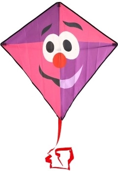 Różowo‑fioletowe wykonanie z uśmiechniętą buzią jest świetnie widoczne, więc dzieci i dorośli łatwo śledzą latawiec.