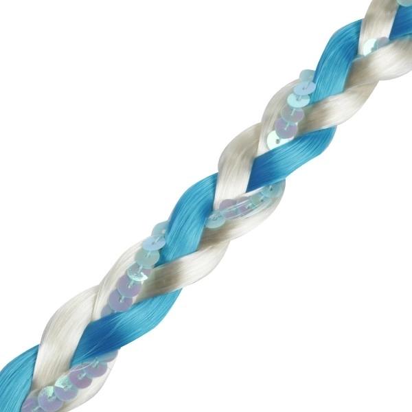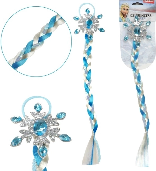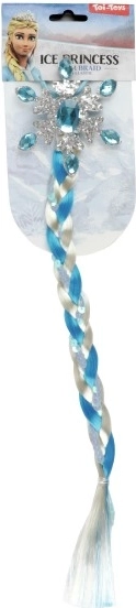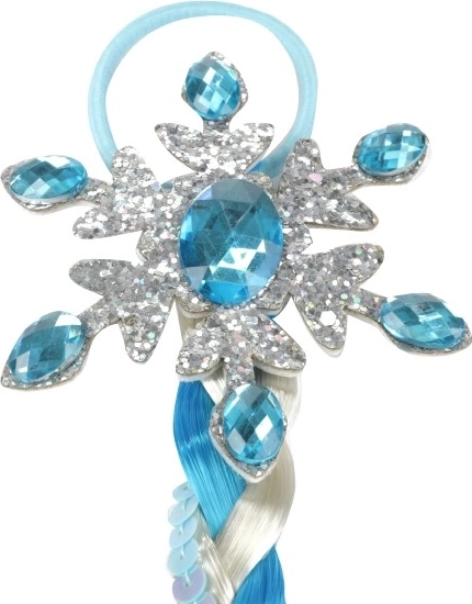 Warkocz Lodowa Księżniczka został stworzony z niebiesko-białych pasm, ozdobiony tematycznymi płatkami śniegu i cekinami. Jest łatwo przypinany dzięki gumce, co zapewnia wygodne noszenie.
