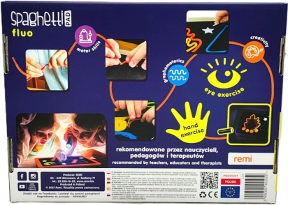Zestaw Spaghetti Fluo wprowadza magiczną grę światła i kolorów. Elastyczne sznurki łatwo przymocujesz do tablicy z rzepem i w kilka chwil stworzysz oryginalne motywy albo skopiujesz wzory z kart pracy. Po naświetleniu latarką LED z fluorescencyjnym markerem motywy ożyją wyrazistym, świetlistym efektem – idealne do tworzenia, nauki i relaksu.