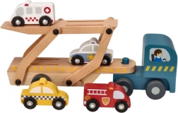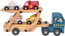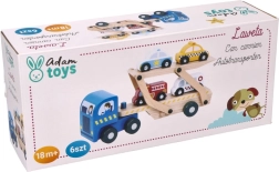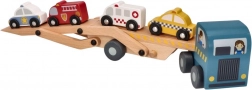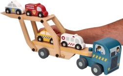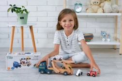 Ten drewniany transporter oferuje świetną zabawę dla dzieci dzięki swojej różnorodności i wysokiej jakości wykonania. Zawiera odłączaną przyczepę, która pomieści cztery uroczo pomalowane drewniane pojazdy.