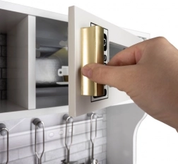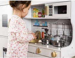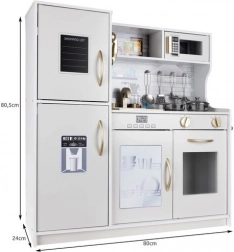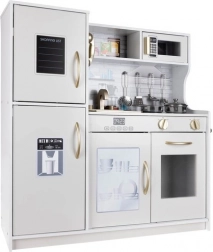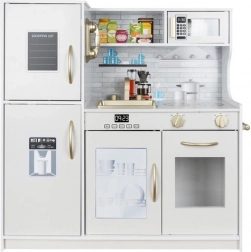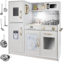 Ta drewniana kuchnia XL została zaprojektowana na długie godziny zabawy. Zintegrowane podświetlenie LED umieścisz wedle uznania pod półką, w szafce lub w piekarniku, a obrotowe przełączniki z klikiem tworzą wrażenie prawdziwego gotowania. Solidna konstrukcja z MDF i eleganckie biało‑złote wykończenie będą ozdobą pokoju dziecięcego.