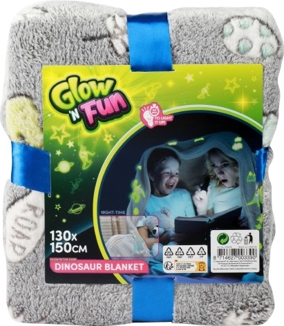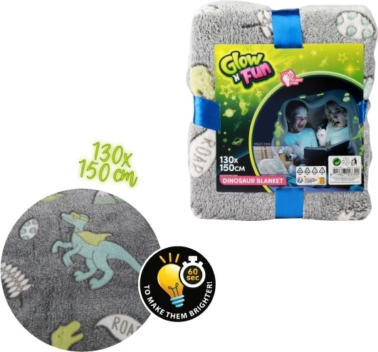 Miękki i ciepły koc z wzorem dinozaurów, które naprawdę świecą w ciemności. Wystarczy krótko go naświetlić, aby cieszyć się magicznym nocnym efektem, przyjemnym pluszowym materiałem oraz praktycznym rozmiarem 130 × 150 cm do odpoczynku w domu i w podróży.