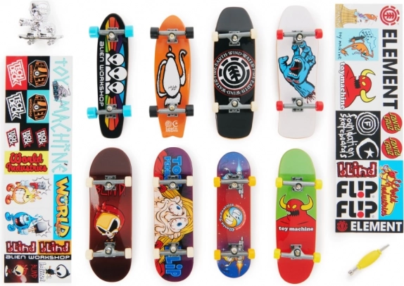 - 8× fingerboard; może zawierać naklejki i drobne akcesoria w zależności od edycji