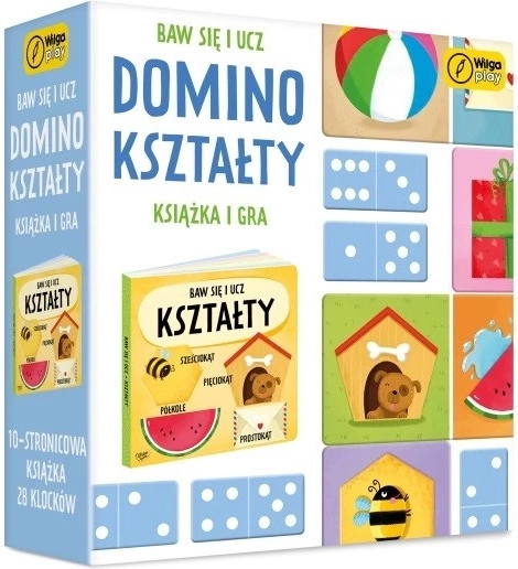 Baw się i ucz Domino kształty gra i książka to zestaw edukacyjny, który łączy zabawę z nauką dla dzieci w wieku od 3 do 5 lat. Pomaga rozwijać umiejętności rozpoznawania kształtów i logicznego myślenia.
